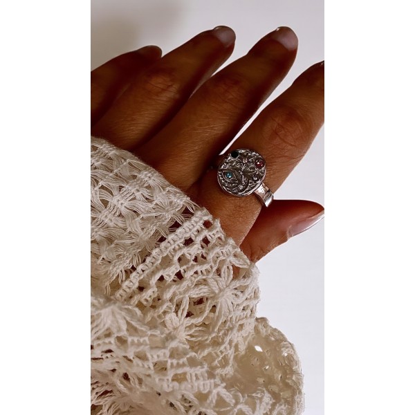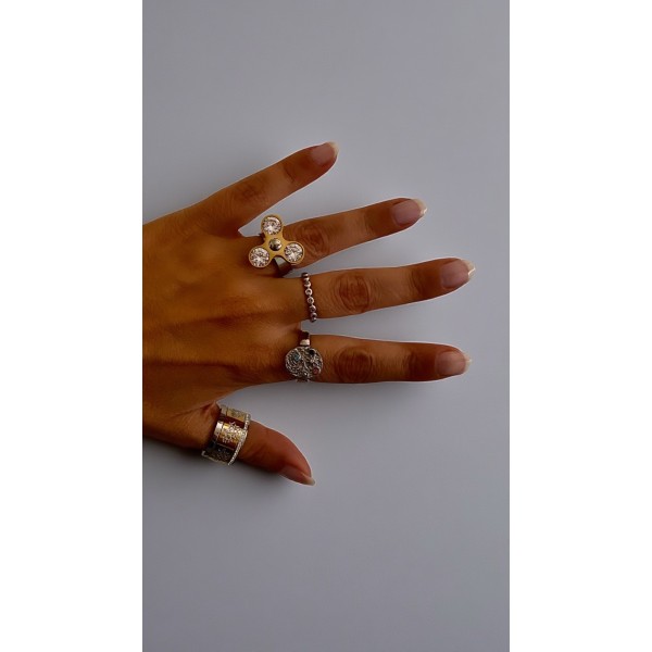 Desperta o poder da cura com o Anel Flower com Unakita. Esta joia em aço inoxidável banhado a ouro combina o detalhe de uma flor gravada com a presença terrosa e equilibrante da Unakita natural – uma pedra que promove o crescimento espiritual e a libertação emocional. Um toque de natureza e significado que transforma qualquer visual.