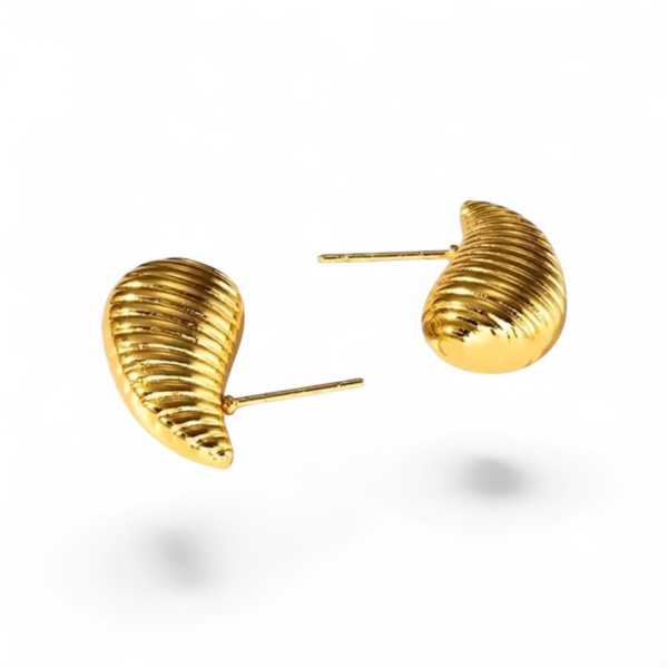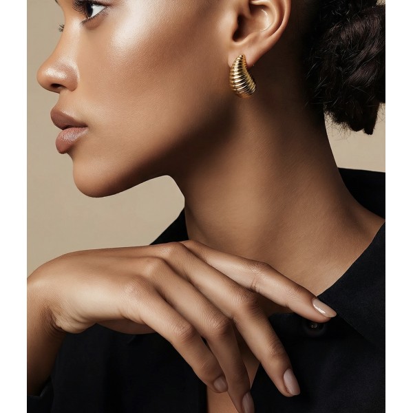 … são a fusão perfeita entre sofisticação e modernidade. Criados em aço inoxidável banhado a ouro 18K, exibem um design ondulado e texturizado que capta a luz de forma única, refletindo brilho e movimento a cada gesto.