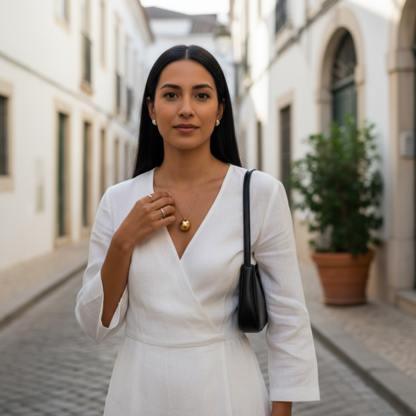 Este colar é uma verdadeira jóia espiritual. O coração sagrado, em madrepérola luminosa, simboliza a pureza e o amor incondicional, enquanto o Olho Turco no centro representa a proteção divina contra as energias negativas. O brilho dourado do aço realça o design radiante, evocando luz, fé e força interior.