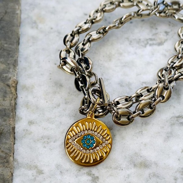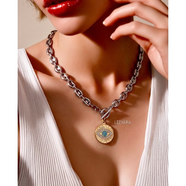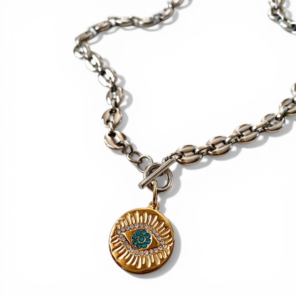 Uma jóia marcante que une força, estilo e significado espiritual. Este colar destaca-se pela sua corrente robusta em aço inoxidável e pelo pendente com o símbolo do olho turco, conhecido pela sua poderosa energia de proteção contra inveja e energias negativas.