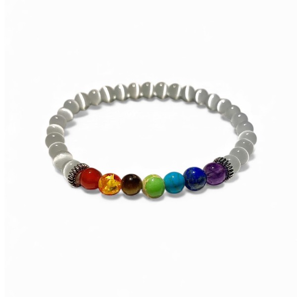 A Pulseira dos Sete Chakras com Selenite é um amuleto de equilíbrio, cura e alinhamento energético. Cada conta representa um dos centros de energia do teu corpo — da raiz à coroa — ajudando-te a restaurar harmonia, foco e bem-estar interior.