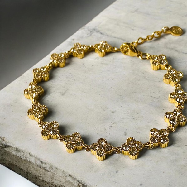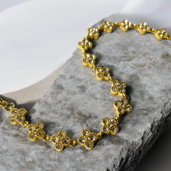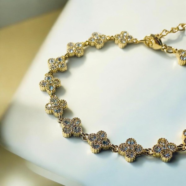 Sofisticada e cheia de encanto, esta pulseira em aço inoxidável com acabamento dourado é composta por delicados trevos cravejados com zircónias brilhantes, criando um efeito luminoso e elegante em cada movimento.